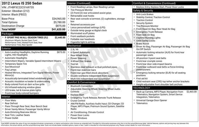 Clean CARFAX. Black 2012 Lexus IS 250 RWD 6-Speed 2.5L V6 DOHC 24V VVT-i 13 Speakers, 17 x 8 Split-Spoke Aluminum Alloy Wheels, 4-Wheel Disc Brakes, ABS brakes, Air Conditioning, Alloy wheels, AM/FM radio: SiriusXM, Auto-dimming Rear-View mirror, Automatic temperature control, Brake assist, Bumpers: body-color, CD player, Compass, Delay-off headlights, Driver door bin, Driver vanity mirror, Dual front impact airbags, Dual front side impact airbags, Electronic Stability Control, Emergency communication system: Safety Connect, Four wheel independent suspension, Front anti-roll bar, Front Bucket Seats, Front Center Armrest, Front dual zone A/C, Front fog lights, Front reading lights, Fully automatic headlights, Garage door transmitter: HomeLink, Heated door mirrors, Illuminated entry, Knee airbag, Leather Seat Trim, Lexus Premium Audio System, Low tire pressure warning, Occupant sensing airbag, Outside temperature display, Overhead airbag, Overhead console, Panic alarm, Passenger door bin, Passenger vanity mirror, Power door mirrors, Power driver seat, Power moonroof, Power passenger seat, Power steering, Power windows, Radio data system, Rear anti-roll bar, Rear reading lights, Rear seat center armrest, Rear window defroster, Remote keyless entry, Security system, Speed control, Speed-sensing steering, Speed-Sensitive Wipers, Steering wheel mounted audio controls, Tachometer, Telescoping steering wheel, Tilt steering wheel, Traction control, Trip computer, Turn signal indicator mirrors, Variably intermittent wipers.