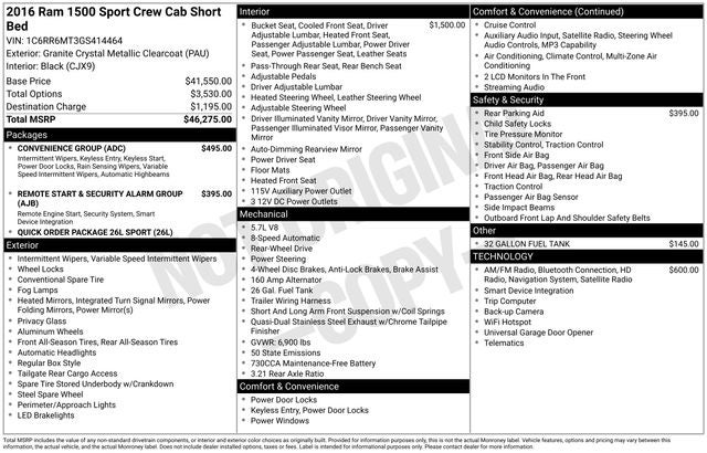 1 Yr. Trial (Registration Required), 115V Auxiliary Power Outlet, 20 x 9 Polished Aluminum Wheels, 3.21 Rear Axle Ratio, 32 Gallon Fuel Tank, 4-Wheel Disc Brakes, 5-Year SiriusXM Traffic Service, 5-Year SiriusXM Travel Link Service, 6 Speakers, ABS brakes, Adjustable pedals, Air Conditioning, Alloy wheels, AM/FM radio, Auto High Beam Headlamp Control, Auto-dimming door mirrors, Auto-dimming Rear-View mirror, Automatic temperature control, Brake assist, Bucket Seats, Bumpers: body-color, Center Hub, Cloth Bucket Seats, Compass, Convenience Group, Delay-off headlights, Driver door bin, Driver vanity mirror, Dual front impact airbags, Dual front side impact airbags, Electronic Stability Control, Emergency communication system: Uconnect Access, Folding Flat Load Floor Storage, Front anti-roll bar, Front Bucket Seats, Front Center Armrest w/Storage, Front dual zone A/C, Front fog lights, Front reading lights, Front wheel independent suspension, Full Length Upgraded Floor Console, Fully automatic headlights, Garage door transmitter, GPS Navigation, HD Radio, Heated door mirrors, Heated front seats, Heated steering wheel, High Back Seats, Illuminated entry, Keyless Enter-N-Go, Leather steering wheel, Low tire pressure warning, Occupant sensing airbag, Outside temperature display, Overhead airbag, Overhead console, Panic alarm, ParkSense Front/Rear Park Assist System, ParkView Rear Back-Up Camera, Passenger door bin, Passenger vanity mirror, Power door mirrors, Power driver seat, Power Lumbar Adjust, Power steering, Power windows, Quick Order Package 26L Sport, Radio data system, Radio: Uconnect 8.4, Radio: Uconnect 8.4 NAV, Rain Sensitive Windshield Wipers, Rear 60/40 Split Folding Seat, Rear anti-roll bar, Rear seat center armrest, Rear step bumper, Remote keyless entry, Remote Proximity Keyless Entry, Remote Start & Security Alarm Group, Remote Start System, Security Alarm, SIRIUSXM Traffic, SiriusXM Travel Link, Speed control, Split folding rear seat, Steering wheel mounted audio controls, Tachometer, Tilt steering wheel, Traction control, Trip computer, Turn signal indicator mirrors, Uconnect Access 1 Year Trial, Variably intermittent wipers, Voltmeter.