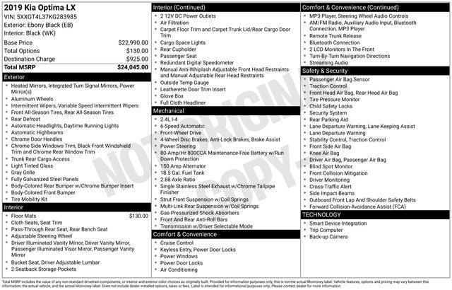 Priced below KBB Fair Purchase Price! Ebony Black 2019 Kia Optima LX FWD 6-Speed Automatic with Sportmatic 2.4L I4 DGI DOHC 4-Wheel Disc Brakes, 6 Speakers, 6.5J x 16 Silver Alloy Wheels, ABS brakes, Air Conditioning, Alloy wheels, AM/FM radio, Anti-whiplash front head restraints, Apple CarPlay & Android Auto, Auto High-beam Headlights, Brake assist, Bumpers: body-color, Carpet Floor Mats, Cloth Seat Trim, Delay-off headlights, Driver door bin, Driver vanity mirror, Dual front impact airbags, Dual front side impact airbags, Electronic Stability Control, Four wheel independent suspension, Front anti-roll bar, Front Bucket Seats, Front Center Armrest, Front reading lights, Fully automatic headlights, Heated door mirrors, Illuminated entry, Knee airbag, Low tire pressure warning, Occupant sensing airbag, Outside temperature display, Overhead airbag, Overhead console, Panic alarm, Passenger door bin, Passenger vanity mirror, Power door mirrors, Power steering, Power windows, Radio data system, Radio: AM/FM/MP3 Audio System, Rear anti-roll bar, Rear seat center armrest, Rear window defroster, Remote keyless entry, Security system, Speed control, Speed-sensing steering, Split folding rear seat, Steering wheel mounted audio controls, Tachometer, Telescoping steering wheel, Tilt steering wheel, Traction control, Trip computer, Turn signal indicator mirrors, Variably intermittent wipers.