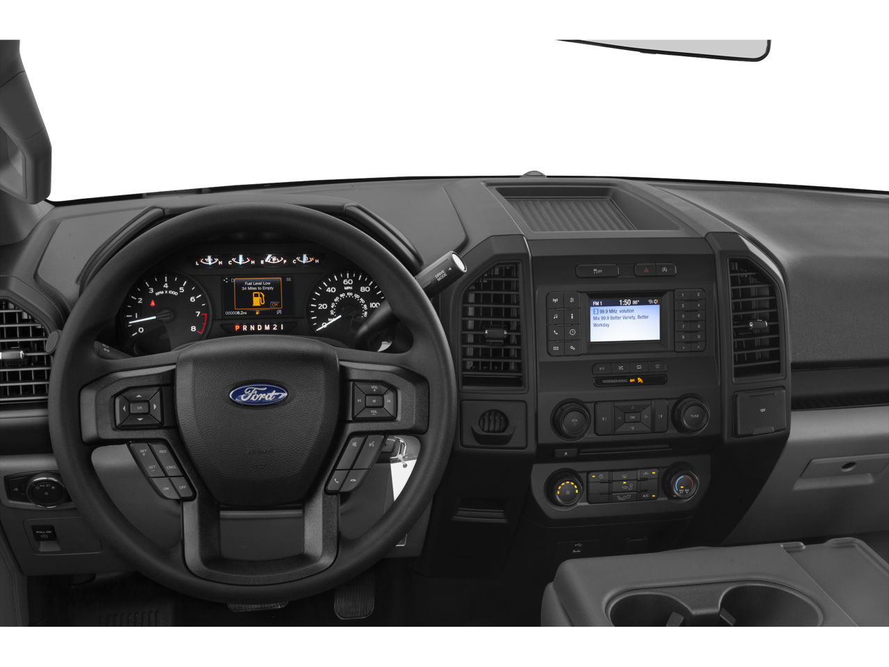 The exterior of this F-150 XL features a sleek and durable white finish, complemented by 17 silver steel wheels and a rear step bumper for easy access. Inside, the spacious cabin offers comfortable cloth seating, a front center armrest, and convenient storage solutions.