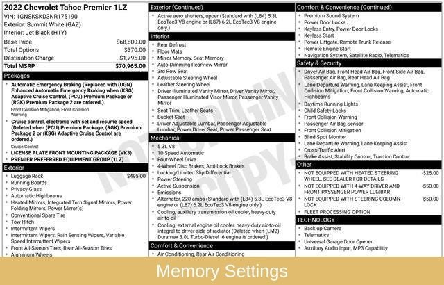 Step inside and you'll be surrounded by a wealth of comfort and convenience features. Enjoy the Bose 10-Speaker Centerpoint Surround Audio System, Rear Air Conditioning, Enhanced Driver Information Center, and the convenience of Hands-Free Rear Power Programmable Liftgate. The Tahoe Premier also offers the added luxury of Memory Seats, Memory Settings, Remote Keyless Entry, and Remote Start, ensuring a personalized and effortless driving experience.