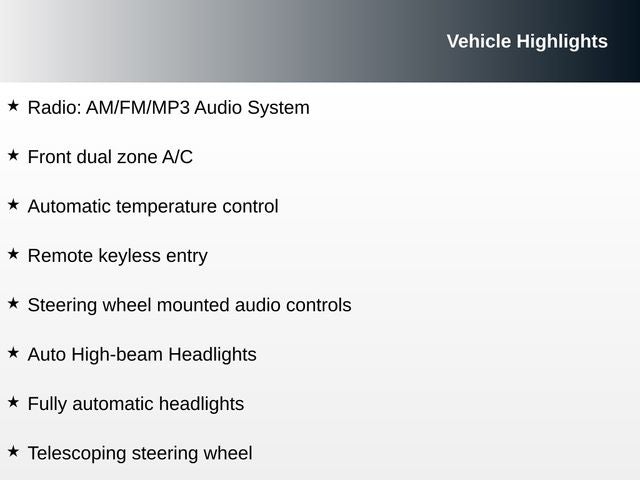 - Radio: AM/FM/MP3 Audio System -inc: 6 speakers, 8" display screen, HD Radio, USB ports, Bluetooth® wireless technology, wireless Android Auto and Apple CarPlay