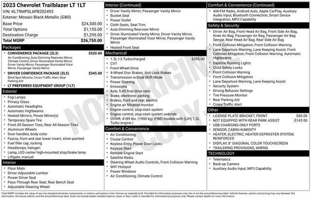 Boasting a sleek and modern exterior, the TrailBlazer LT commands attention with its bold presence. Under the hood, the 1.3L Ecotec Turbo DOHC SIDI engine with Variable Valve Timing delivers an impressive 155 horsepower and 174 lb-ft of torque, providing the power you need for a confident and responsive ride. With an EPA-estimated 29 city/33 highway mpg, this SUV offers exceptional fuel efficiency, allowing you to go further on every tank.