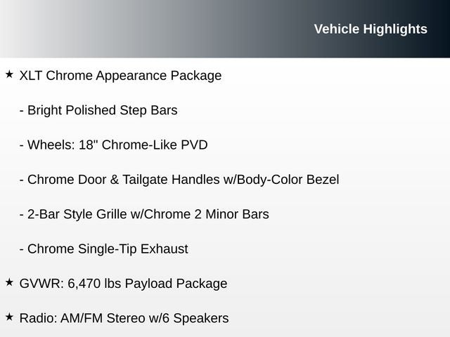 • The XLT Chrome Appearance Package adds a touch of sophistication with its chrome exterior accents, including the grille, door handles, and tailgate trim.