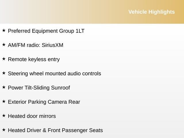 Alloy wheels, AM/FM radio: SiriusXM, Exterior Parking Camera Rear, Heated door mirrors, Heated Driver & Front Passenger Seats, Power Tilt-Sliding Sunroof, Preferred Equipment Group 1LT, Remote keyless entry, Steering wheel mounted audio controls, 17 Aluminum Wheels, 4-Wheel Disc Brakes, 6 Speakers, 6-Speaker Audio System Feature, 6-Way Manual Front Passenger Seat Adjuster, 8-Way Power Driver Seat Adjuster, ABS brakes, Air Conditioning, Auto High-beam Headlights, Automatic temperature control, Brake assist, Bumpers: body-color, Compass, Delay-off headlights, Driver door bin, Driver vanity mirror, Dual front impact airbags, Dual front side impact airbags, Electronic Stability Control, Emergency communication system: OnStar and Chevrolet connected services capable, Four wheel independent suspension, Front anti-roll bar, Front Bucket Seats, Front Center Armrest, Front dual zone A/C, Front reading lights, Fully automatic headlights, Heated front seats, Illuminated entry, Knee airbag, Low tire pressure warning, Occupant sensing airbag, Outside temperature display, Overhead airbag, Overhead console, Panic alarm, Passenger door bin, Passenger vanity mirror, Power door mirrors, Power Driver Lumbar Control Seat Adjuster, Power driver seat, Power steering, Power windows, Premium audio system: Chevrolet Infotainment 3 Plus, Premium Cloth Seat Trim, Radio data system, Radio: Chevrolet Infotainment 3 System, Rear anti-roll bar, Rear reading lights, Rear seat center armrest, Rear side impact airbag, Rear window defroster, Security system, SiriusXM, Speed control, Split folding rear seat, Tachometer, Telescoping steering wheel, Tilt steering wheel, Traction control, Trip computer, Variably intermittent wipers, Voltmeter, Wireless Apple CarPlay/Android Auto, Alloy wheels, AM/FM radio: SiriusXM, Exterior Parking Camera Rear, Heated door mirrors, Heated Driver & Front Passenger Seats, Power Tilt-Sliding Sunroof, Preferred Equipment Group 1LT, Remote keyless entry, Steering wheel mounted audio controls.
